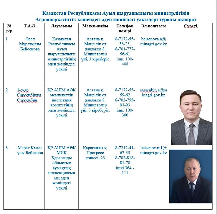 Қазақстан Республикасы Ауыл шаруашылығы министрлігінің Агроөнеркәсіптік кешендегі әдеп жөніндегі уәкілдері туралы ақпарат